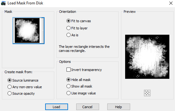 Install your plugin before beginning Open a new transparent image 600 x 600 and flood fill with white - we will eliminate it when we're finished Open paper 2, resize to 600 x 600, copy, close and paste as new layer Layers, load save mask, load mask from disk Choose Mask65 MB&SW with these settings: ![]() Click Load Layers, merge, merge group Layers duplicate From the top node, pull down until you have something like this ![]() Open element 11, resize to 450 height, copy, close, paste as new layer Move up so the ribbon is near the top of the tag Open the photo you want to use, copy and close, paste as new layer Move below the frame layer Position how you want the photo to appear in the frame Click the frame layer to activate it With your magic wand, click inside the frame Selections, modify, expand, 10 Click the photo layer Edit, cut Selections, select none Delete the photo layer Edit, paste as new layer and move the photo into the frame Make sure the photo layer is below the frame layer Open some of the flowers, resize and arrange them behind the photo layer I used elements 5, 6, and 17 Once you're happy with that, click the frame layer to activate it Open your Veronica Nunez tube, resize to 450 width, copy and close Paste as new layer and move down in front of the bottom of the frame Click the frame layer to activate it again Arrange some of the egss and greenery from the kit behind the bunny Just resize everything to suit the look you want Add the butterfly at the center of the bow Go through your layers and add drop shadows I used 0, 3, 25, 6, black If you want to resize this, do that now before adding any text Delete the white background layer Add your copyright info and license number for the Veronica Nunez tube Add whatever text you want - I did it like an invitation for an egg hunt I used Bluebell, #494e7e and Bumblebee same color, then positioned them and merged them into one layer Selections, select all Selections, float Selections, defloat Selections, modify, Select Selection Borders 2, outside, white New raster layer Fill with white Drop shadow, 0, 2, 25, 2, black Select none Layers, merge, merge visible and save as a png file Hope you enjoy your tag/invitation! Thanks for trying my tut! tagcatz |